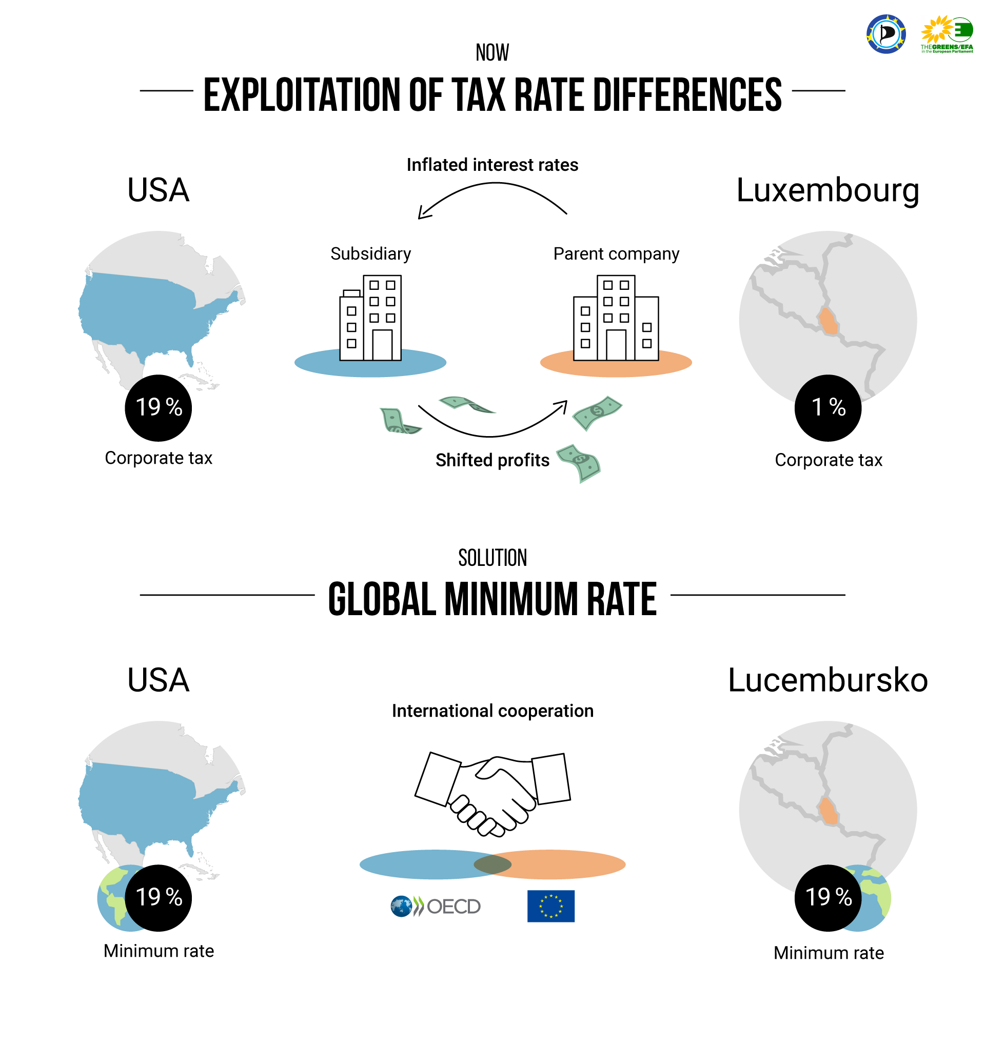 To illustrate these practices, we can use the following example: Imagine an American company whose parent company is based in a tax haven, such as Luxembourg, where the corporate tax rate is around one percent. The federal corporate tax rate is around 21 % of the company’s profits (the difference between revenues and costs), which makes it quite close to the “global” rate of 19 % that some European politicians have considered. How do you turn 21 % to 1 %, though? The American company may deduct costs, meaning higher costs equal lower profits and lower taxes. The parent company can help with that – for example by giving out loans with inadequately high interest rates or by overpricing the goods or services they supply to their subsidiary. The parent company can then get a “cheaper” tax rate at home. In the Czech Republic, we might recognize these practices from an affair concerning the mines in Ostrava and Karvinná. In this case, the parent company Karbon Invest shifted huge amounts of money out of the subsidiary OKD. (https://a2larm.cz/2021/04/privatizace-okd-byla-tragedie-ktera-negativne-ovlivnila-vsechny-aspekty-zivota-v-moravskoslezskem-kraji/) If you want to take a closer look at corporate taxation loopholes, the Deputy Editor of MoneyWeek Tim Bennett provides a nice overview in this video.