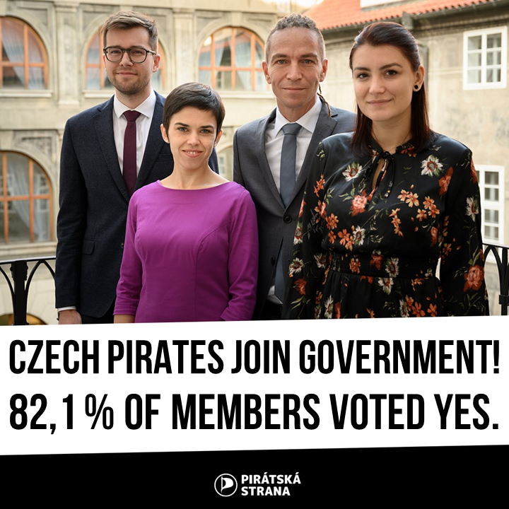 Brussels/Prague, 16/11/2021 – The Czech Pirate Party will participate in the new forming government in the Czech Republic. More than 82% of voting members (888 out of 1082) have agreed with the coalition agreement in yesterday’s party referendum. The Czech Pirates are the first Pirate Party ever joining a regular government. In the European Parliament, they are part of the Greens/EFA Group and in the new government they will be responsible for three sections: the Ministry or Regional Development and Digitization, Ministry of Foreign Affairs, and the Government’s Legislative Council.