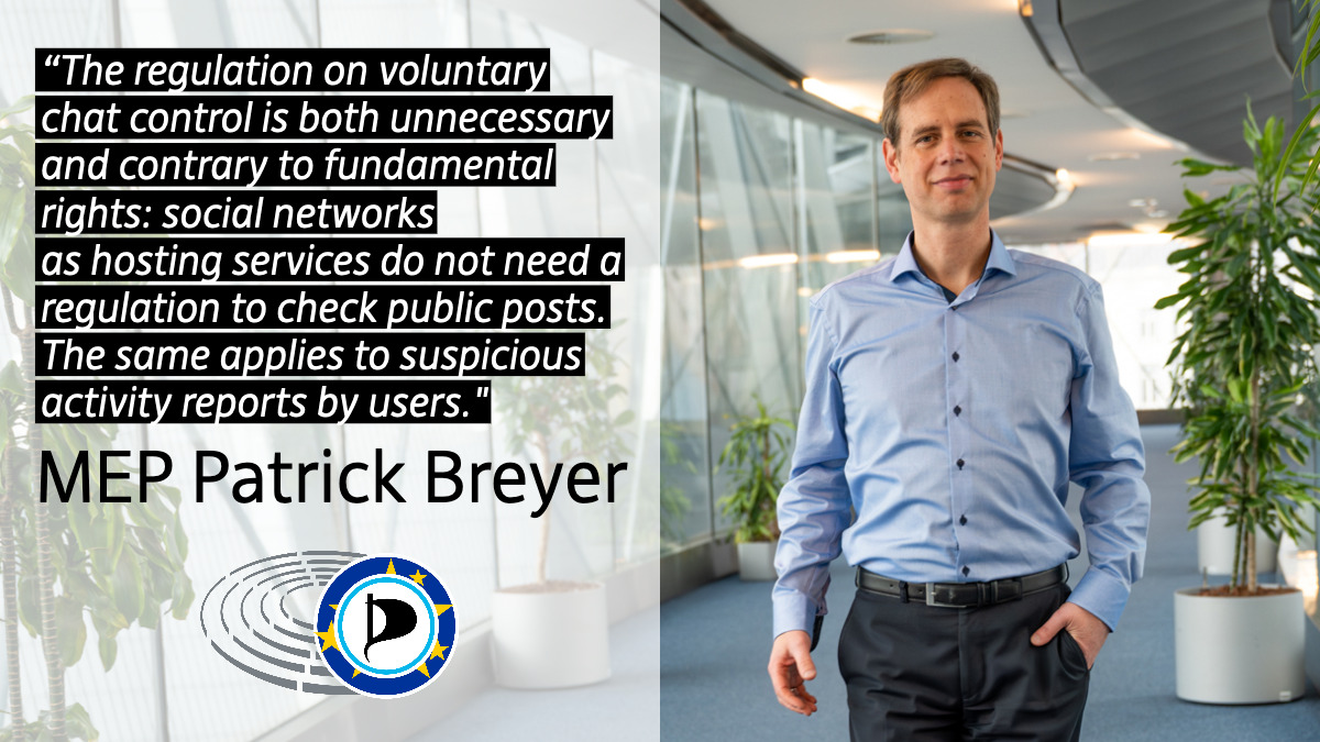 Now that the EU plans for mandatory screening of private communications and undermining secure encryption (chat control 2.0) have been put on ice for the time being due to a lack of majority in the EU Council, last week the European Parliaments‘s socialist chief negotiator Birgit Sippel proposed to agree to extending the existing voluntary chat control regime with the exception of grooming detection algorithms. Pirate Party Member of the European Parliament and most prominent opponent of chat control Patrick Breyer, who is also his group’s lead negotiator, submitted amendments last night on behalf of his group. According to these amendments, voluntary chat controls should expire as they violate fundamental rights. This is confirmed by several legal opinions, including the alternative impact assessment of the EPRS, the Council Legal Service and a study by former ECJ judge Ninon Colneric.