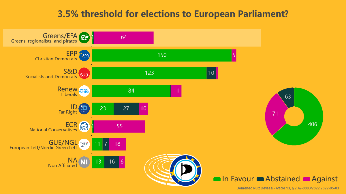 Strasbourg, 03/05/2022 – Today, the European Parliament approved a legislative initiative for new electoral rules to be applied to European elections. Pirate Party Members of the European Parliament strongly oppose the implementation of a highly undemocratic mandatory threshold. The minimum threshold of 3.5% for larger EU countries will result in millions of votes being nullified, which effectively dooms smaller parties in the EU.